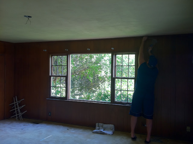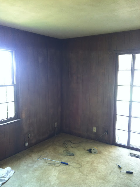 This picture below was taken on Sunday, right before I invested two days of nap time to the actual painting phase of this beastly project. Since the previous pictures, the paneling was completely sanded, primed and the ceiling painted, and new crown molding and casings have been put in. I still have to tackle painting the window, sliding door and I’m hoping to talk my dad into spraying the closet doors white!