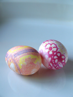 Ahhh, spring time. Nothing sets the tone better than spring flowers, a beautiful Easter dress, and a basket filled with brightly colored eggs. I guess it’s the girly girl in me, but I love Easter. This year I’m going to try something different when I dye my eggs. I found this great idea on an adorable blog The Magic Onions. Silk dyed eggs. Basically it’s wrapping a piece of colorfully patterned silk around your Easter eggs, and boiling them. They finished Easter eggs are amazing. The pattern actually transfers to the eggs. Another thing that I love about this method is that it’s all one step. You wrap the eggs in silk before you hard boil them and there is no clean up of little cups of dye. How much easier does it get than that?